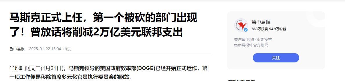 魯中晨報2025-01-22 13:04報道:馬斯克正式上任,第一個被砍的部門出現了!曾放話將削減2萬億美元聯邦支出