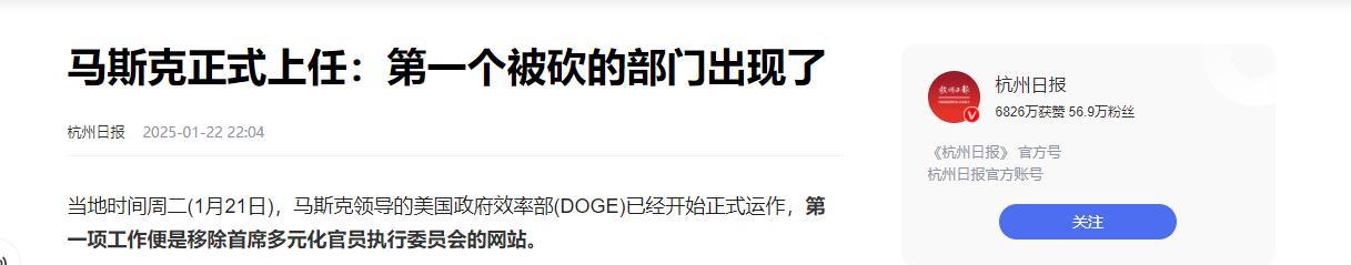 杭州日報2025-01-22 22:04報道:馬斯克正式上任:第一個被砍的部門出現了