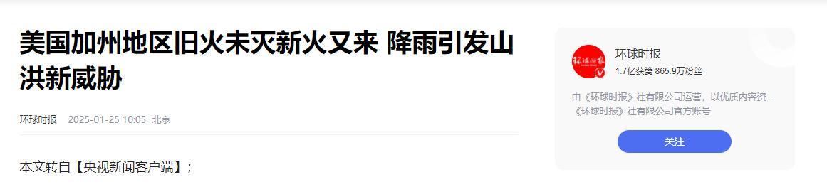 環球時報2025-01-25 10:05報道:美國加州地區舊火未滅新火又來 降雨引發山洪新威脅