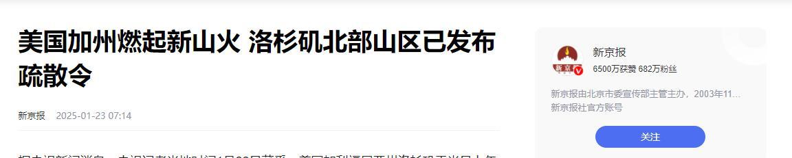 新京報2025-01-23 07:14報道:美國加州燃起新山火 洛杉磯北部山區已發佈疏散令