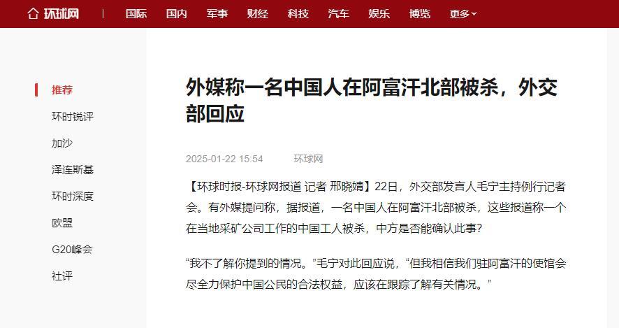 環球網2025-01-22 15:54報道:外媒稱一名中國人在阿富汗北部被殺,外交部回應