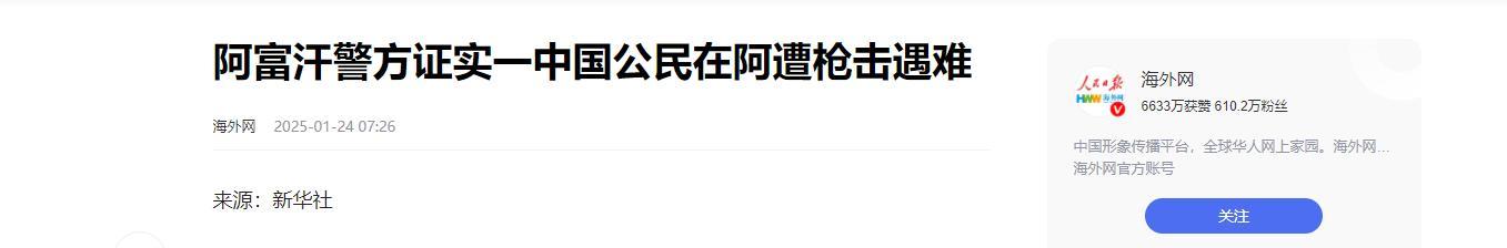 海外網2025-01-24 07:26報道:阿富汗警方證實一中國公民在阿遭槍擊遇難