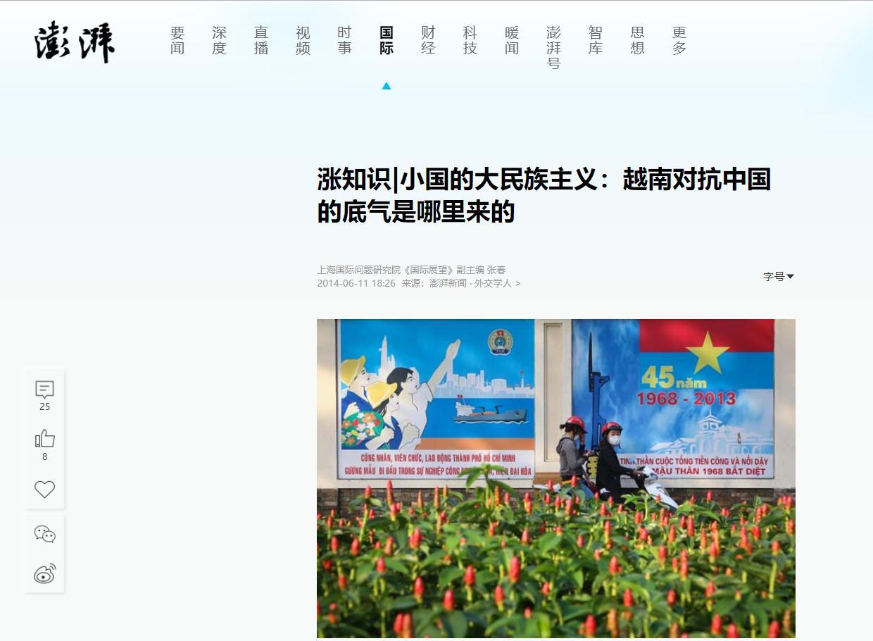 澎湃新聞2014-06-11 18:26報道:漲知識|小國的大民族主義:越南對抗中國的底氣是哪裏來的