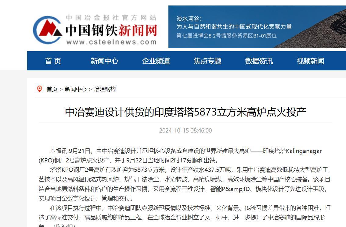 中國鋼鐵新聞網2024-10-15 08:46:00報道:中冶賽迪設計供貨的印度塔塔5873立方米高爐點火投產