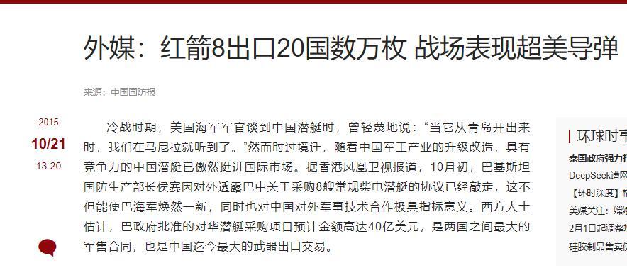 環球網-2015-10/2113:20報道:外媒:紅箭8出口20國數萬枚 戰場表現超美導彈