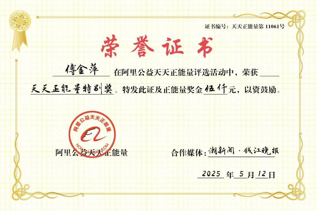 阿里公益天天正能量聯合潮新聞·錢江晚報,爲傅金萍頒發5000元正能量特別獎。
