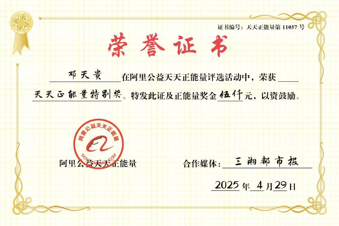 阿里公益天天正能量聯合三湘都市報爲鄧天貴頒發天天正能量特別獎及5000元獎金。