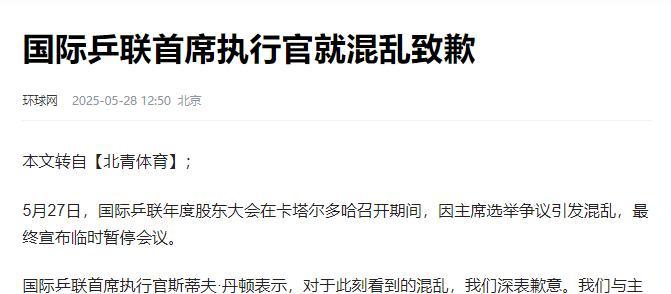 信息來源:環球網 2025年5月28日 《國際乒聯首席執行官就混亂致歉》