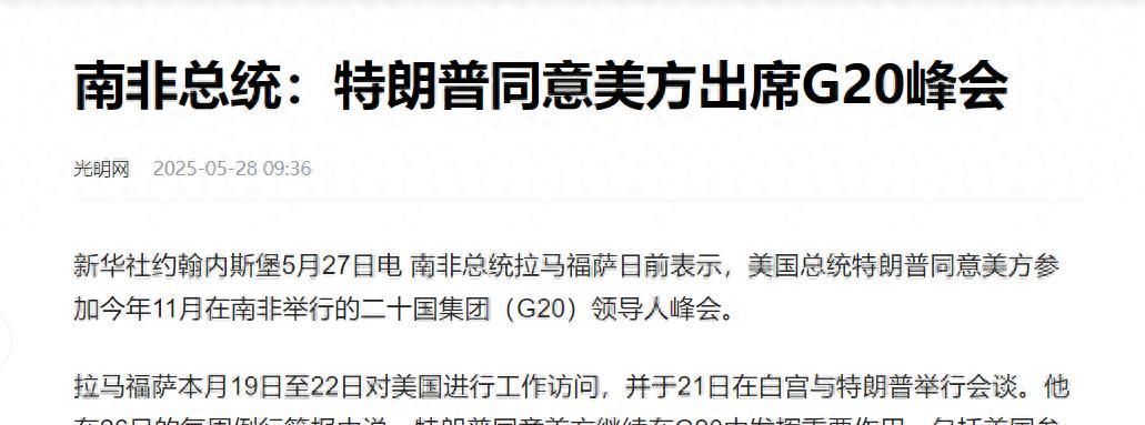 信息來源:光明網 2025年5月28日 《南非總統:特朗普同意美方出席G20峯會》