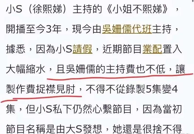就在節目組糾結的時候,自稱在家“自我療愈”的小S聽到了風聲,擔心自己飯碗不保,說動節目的廣告商撤資。