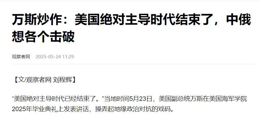 信息來源:觀察者網 2025年5月24日 《萬斯炒作:美國絕對主導時代結束了,中俄想各個擊破》