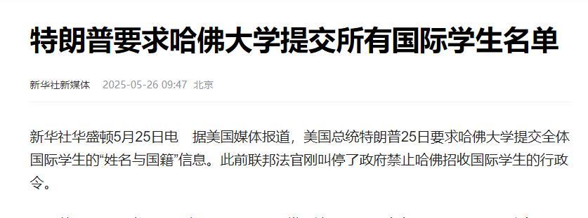 信息來源:新華社 2025年5月26日 《特朗普要求哈佛大學提交所有國際學生名單》