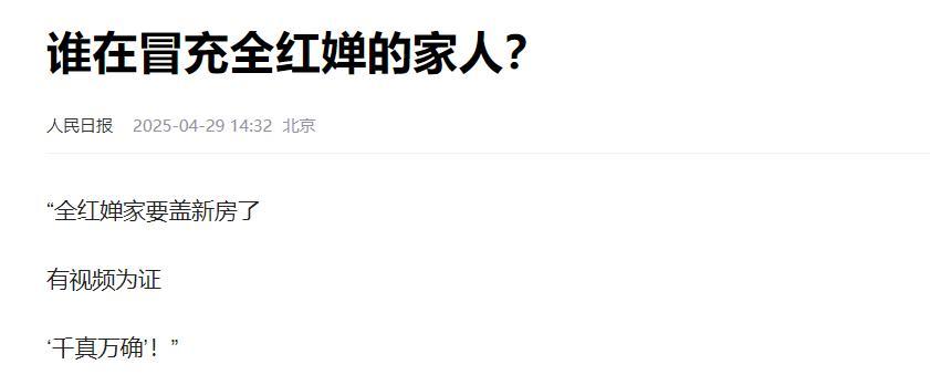 信息來源: 人民日報 2025年4月29日 《誰在冒充全紅嬋的家人?》