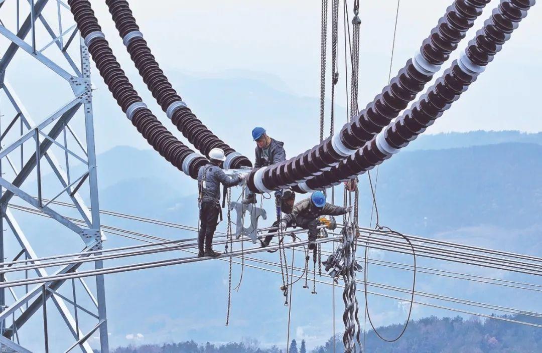 在±800千伏寧夏—湖南特高壓直流輸電工程鄂2標段施工現場,國網湖北送變電公司員工在高空開展導地線附件安裝作業
