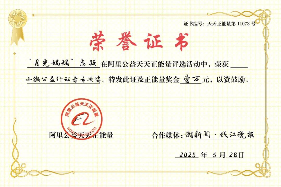 阿里公益天天正能量聯合潮新聞·錢江晚報爲“月光媽媽”高穎頒發小微公益行動者專項獎。