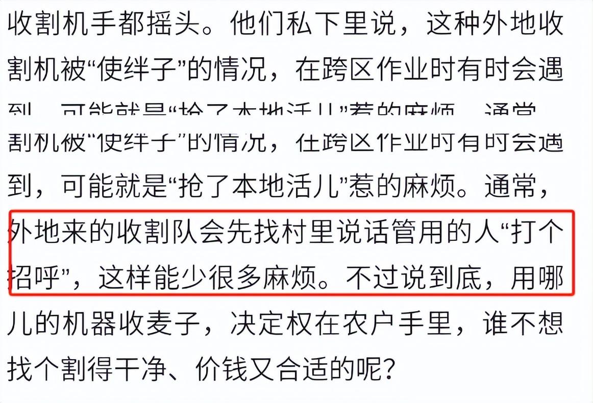 有“懂行兒”的網友表示,外地來的收割機隊伍工作之前,最好跟當地有威望的人搞好關係。