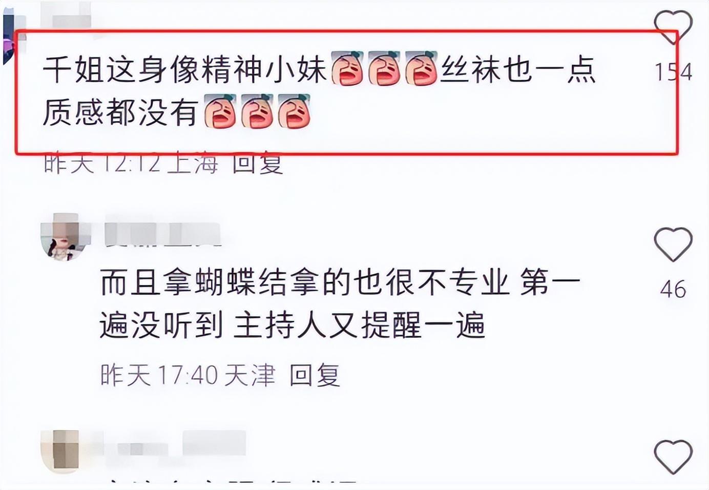 再加上黑色絲襪的質感不是很好,在其他兩位女明星精緻的着裝襯托下,確實顯得有些土氣,被網友嘲諷是“精神小妹穿搭”。