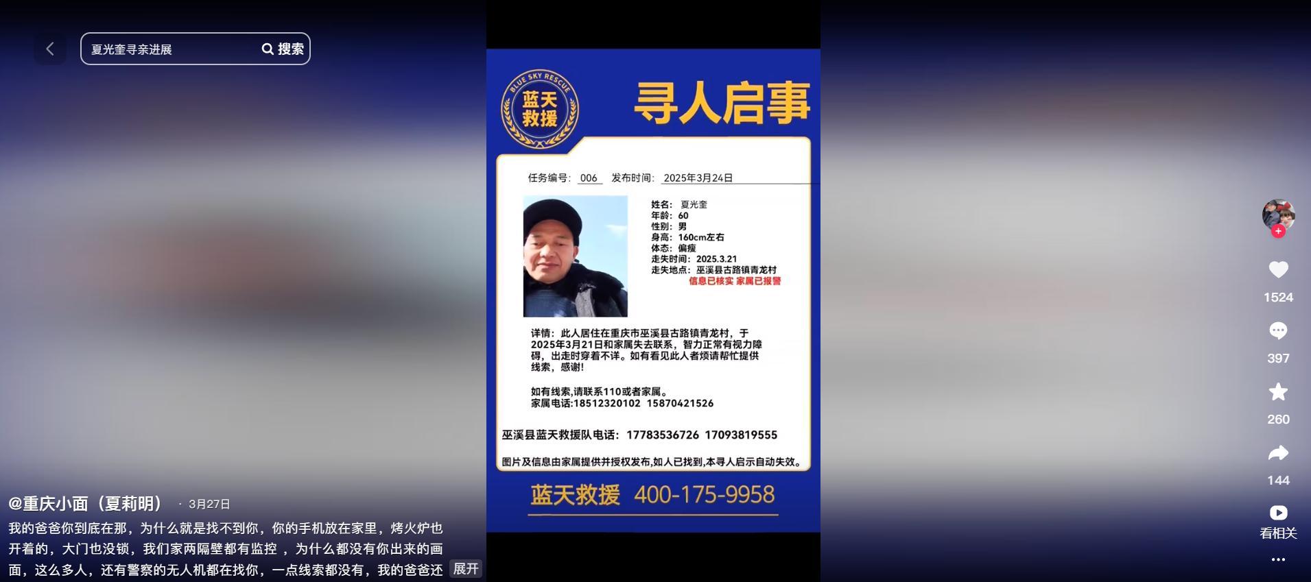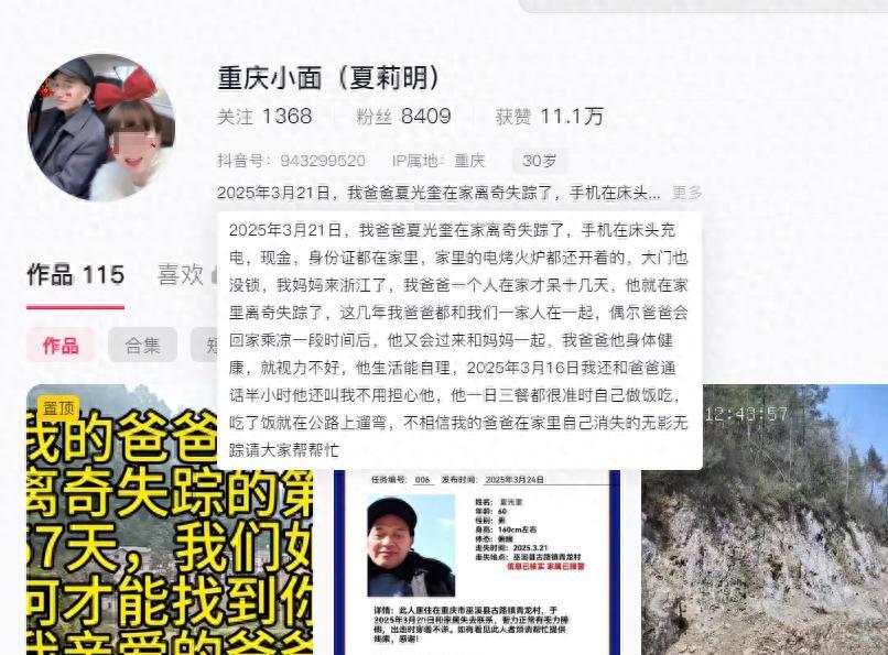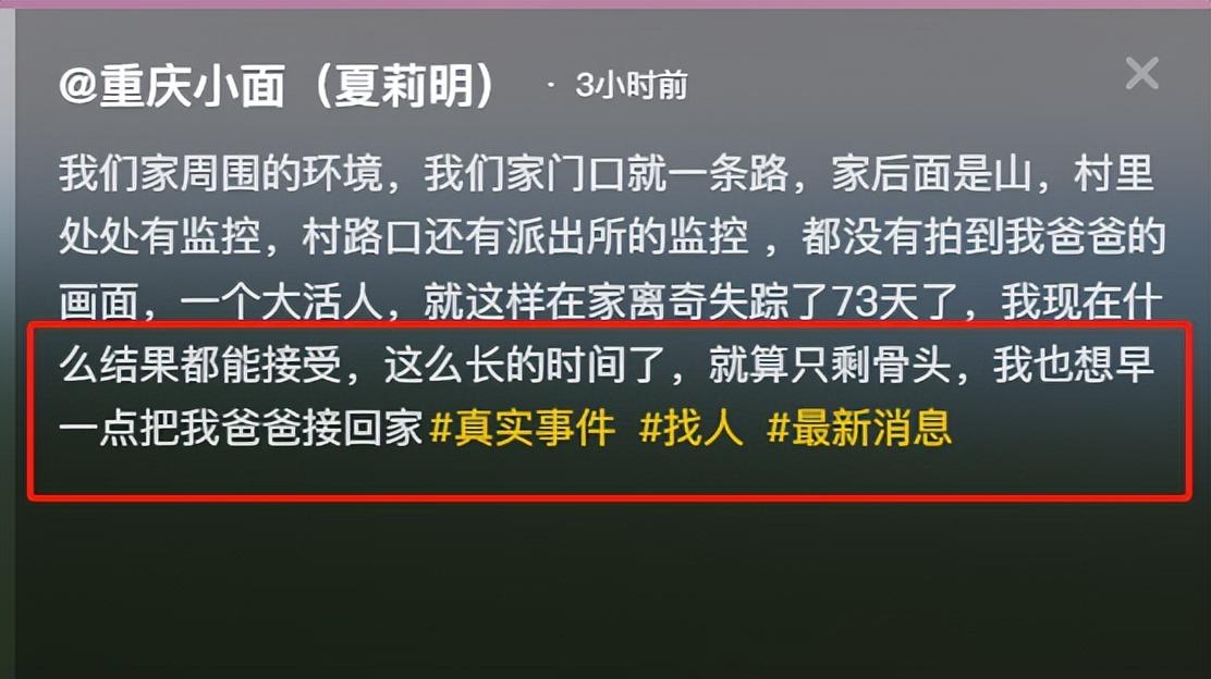 6月5日,網名爲“重慶小面(夏莉明)”的夏女士再次在自己的社交媒體賬號上發佈了父親失蹤的一些關鍵信息。