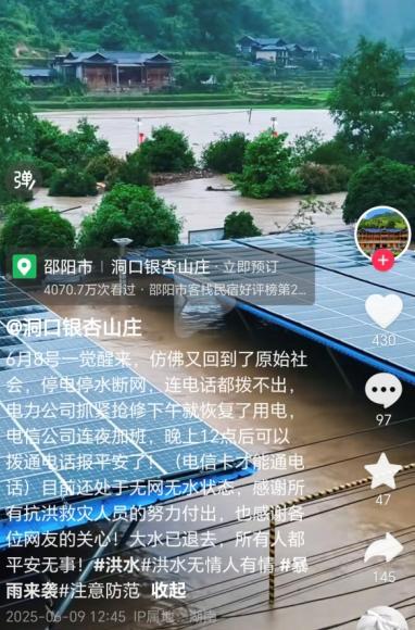 “一覺醒來,彷彿又回到了原始社會。電力公司抓緊搶修恢復用電,電信公司連夜加班,晚上12點終於可以撥通電話報平安了!感謝所有抗洪救災人員的努力付出!大水已退去,所有人都平安無事!”6月9日暴雨過後,湖南洞口縣羅溪瑤族鄉當地居民發佈了一條短視頻,爲央企及時恢復通電、通信點贊。