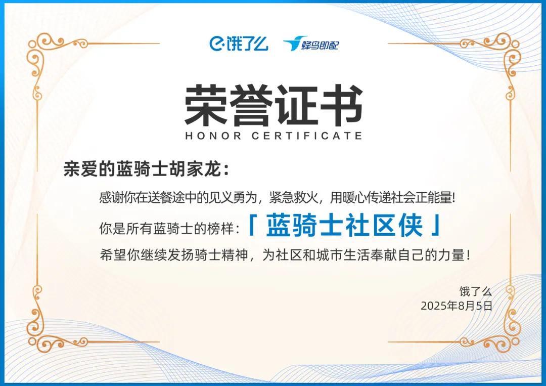 而這一次,胡家龍“教科書式”的滅火行爲,餓了麼頒發了“藍騎士社區俠”榮譽和現金獎勵,阿里公益也頒發了“天天正能量特別獎”,兩項獎勵共1萬元。