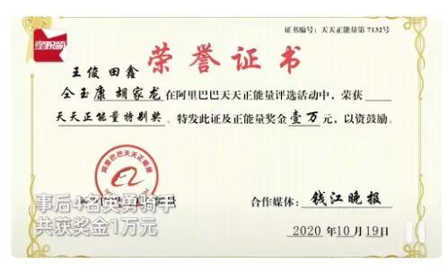 “2020年10月份,市區一家栗子店着火,我和同事們一起去救火的,獲得了阿里天天正能量獎金。”