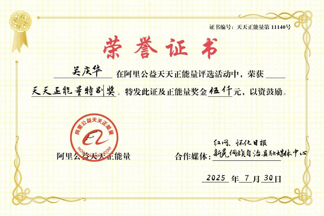 阿里公益天天正能量聯合紅網、懷化日報、新晃侗族自治縣融媒體中心,爲關慶華頒發天天正能量特別獎,發放5000元正能量公益金,爲他助力。