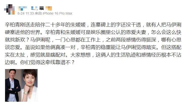 而今朱媛媛逝世100余天,在網上卻傳出了辛柏青和馬伊琍的緋聞,這麼離譜的事情都發生了。或許很多人希望辛柏青能夠早點從喪妻的陰影走出,追求新的幸福。出發點是好的,可實際上,辛柏青依然不能釋懷.........