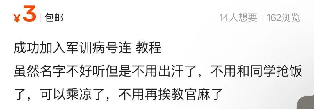 然而,與訓場上的火熱形成對比的是,部分社交平臺與二手交易APP上,“軍訓代訓”“軍訓免訓”證明代辦的灰色服務悄然滋生。這些賣家稱只需提供姓名、年齡、目標醫院即可辦理相關證明,甚至用“學校一般查不出來”的說辭來打消學生的顧慮。這種僞造行爲,不僅涉嫌違紀違法,也折射出部分青年害怕喫苦、畏懼挑戰的心理。