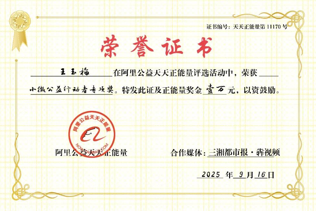 阿里公益天天正能量聯合三湘都市報·犇視頻,爲王玉梅頒發萬元小微公益行動者專項獎。