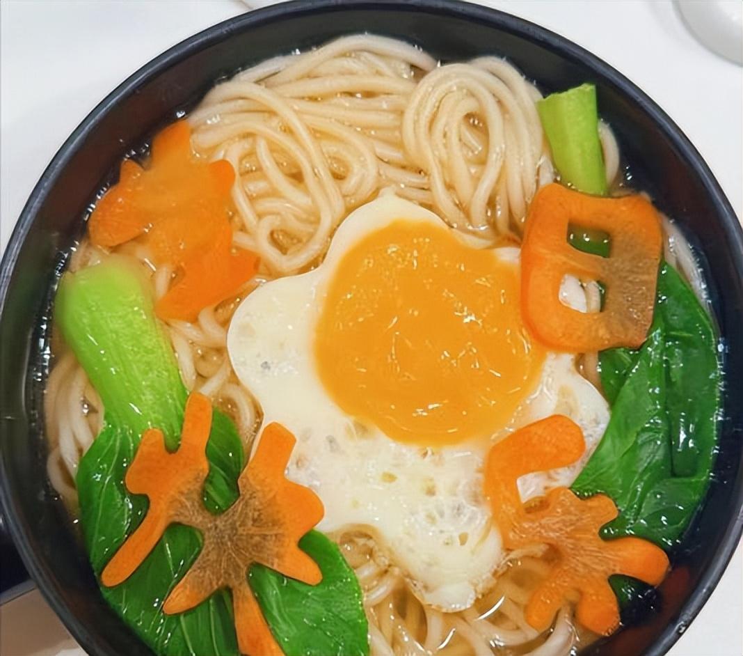 更用心的是那碗長壽麪,白色瓷碗裏的麪條根根分明,臥着金黃的荷包蛋,點綴着翠綠的青菜,最精巧的是王雷用胡蘿蔔刻出的“生日快樂”四個字,靜靜躺在麪湯裏,色香味俱全。