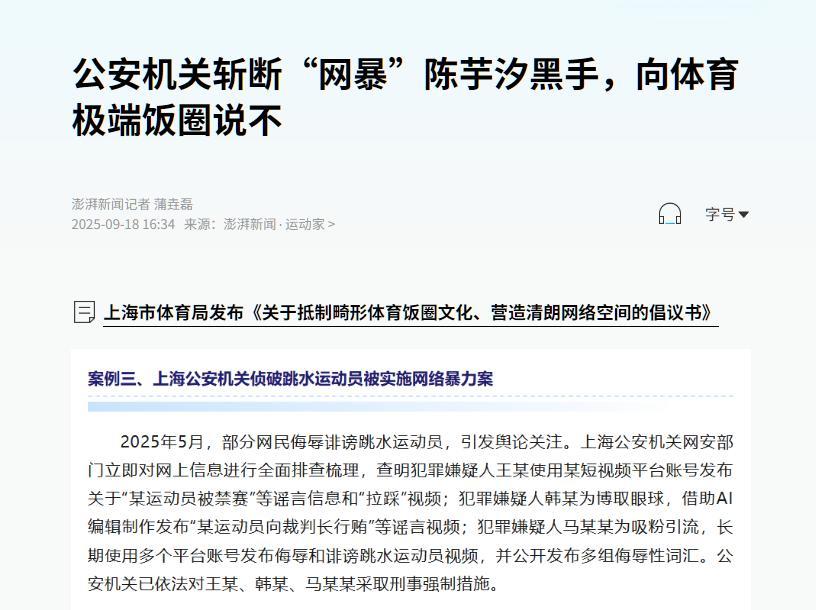 王某編造“某運動員被禁賽”的謠言,韓某用AI技術合成“向裁判長行賄”的虛假視頻,馬某某長期發佈侮辱性內容,三人最終被採取刑事強制措施。