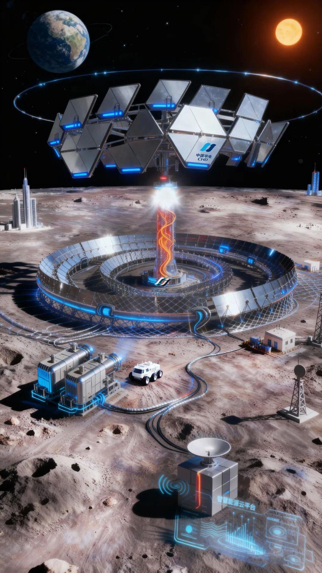 中國華電建設的熔鹽塔式光熱電站由數萬塊智能定日鏡組成,能夠將月表太陽光聚焦至中央集熱塔,並將熱能轉化爲電力,通過無線輸能系統向運維設備持續供電,爲月球發展注入永恆動力。
