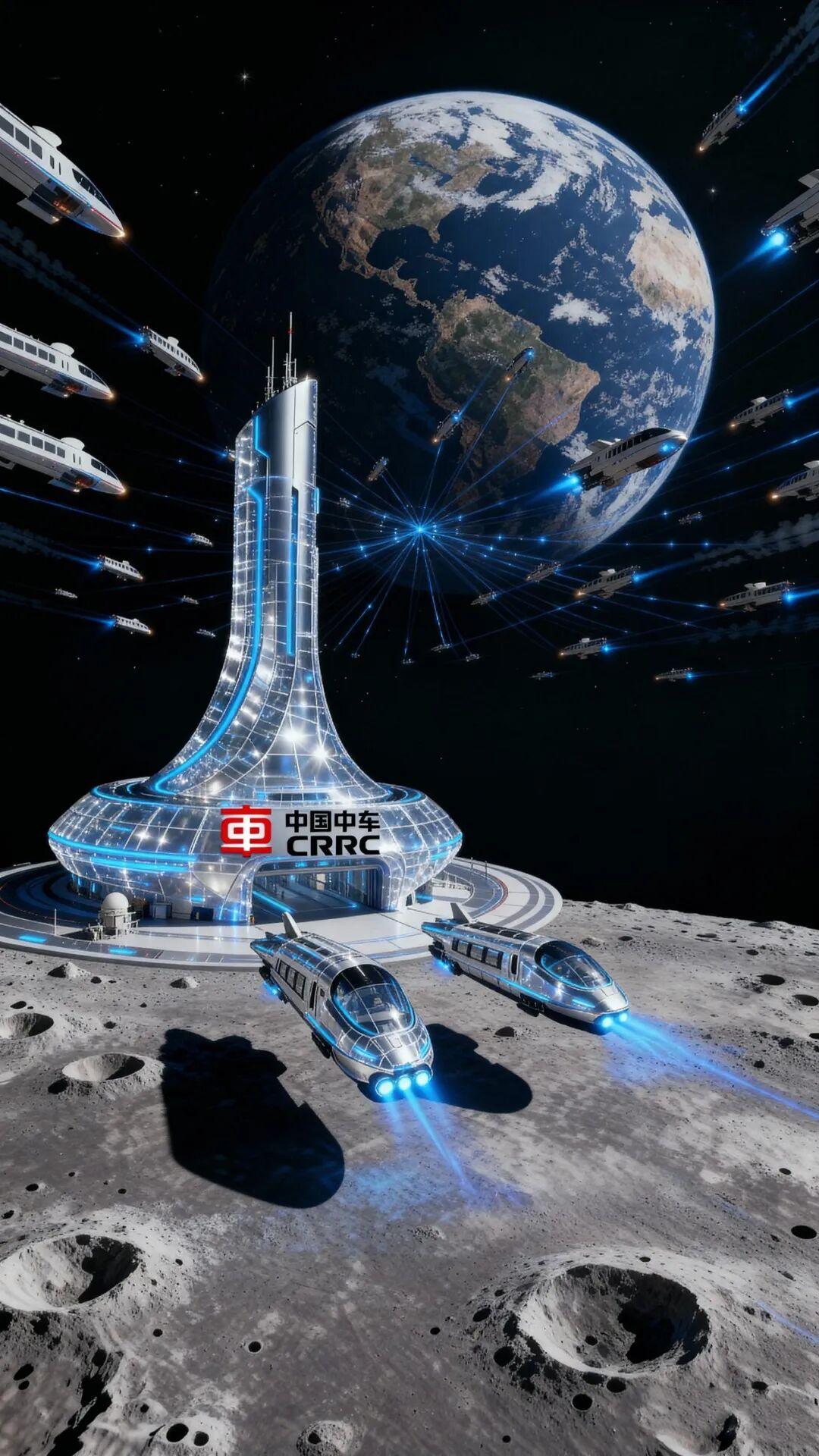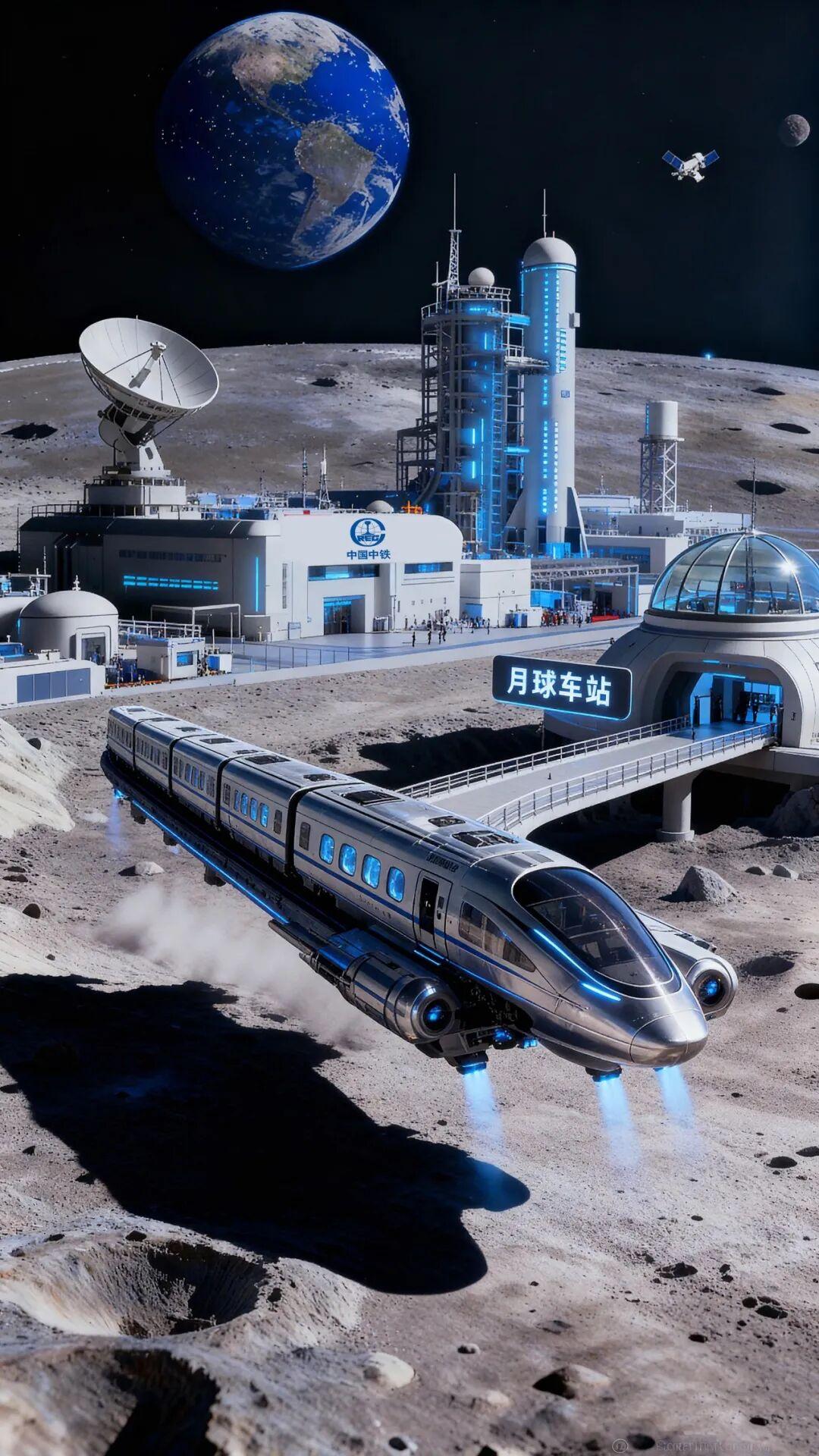 一列採用磁懸浮技術的“月球快線”列車正靜臥於站臺,中國中鐵建設的“月球車站”主體採用3D打印月壤技術建成,流線型穹頂高效抵禦宇宙輻射與微隕石衝擊,標誌着人類地月空間基礎設施建設的嶄新篇章。