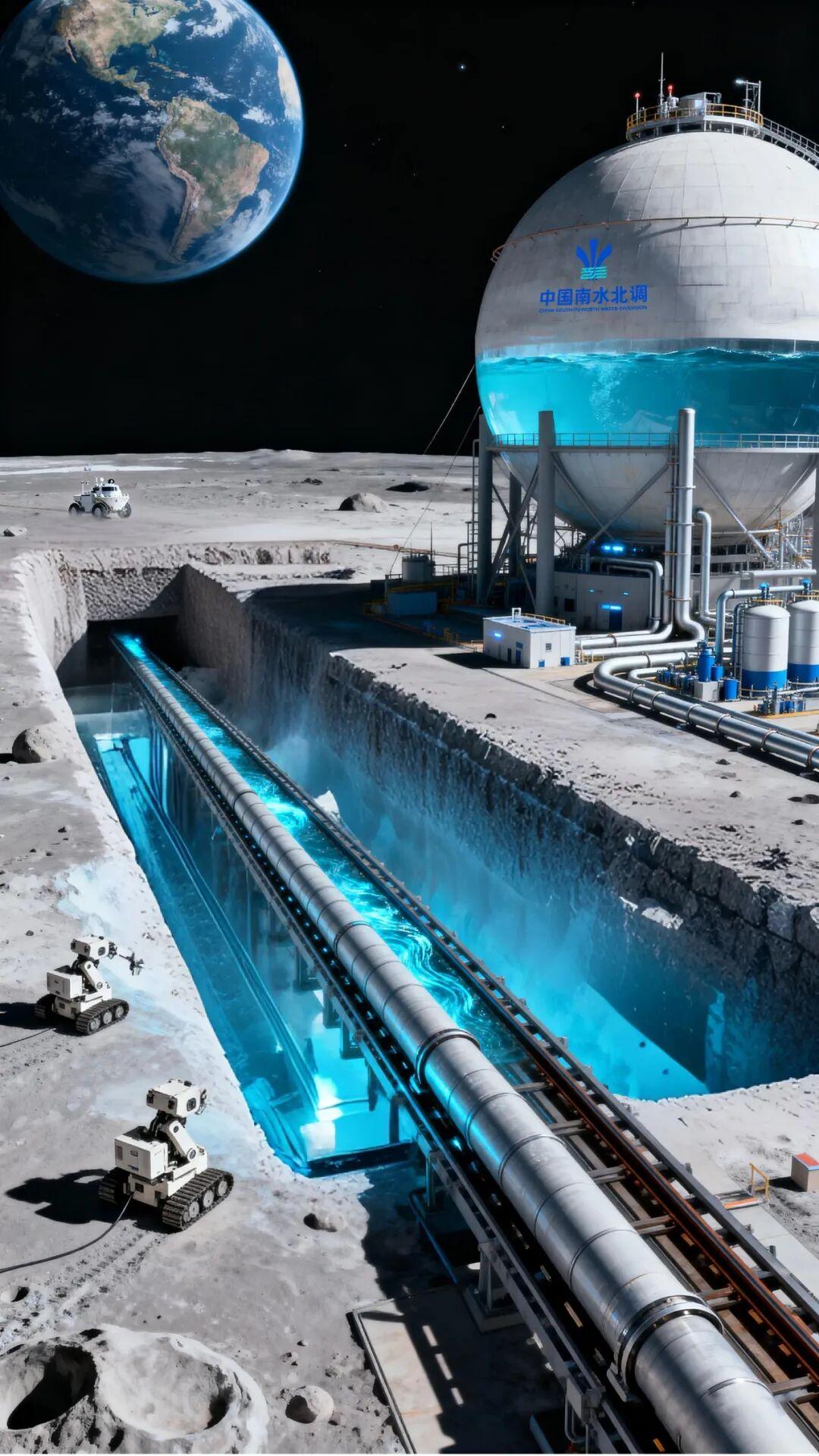 一條上萬公里長的磁懸浮軌道系統像銀色絲帶連接着坑洞和遠方的月球主基地,儲水罐管道網絡連接着水循環處理廠,中國南水北調實現水資源勘探、水冰採集、運輸儲存和水資源循環利用,構建出一條通往生命綠洲的“水冰之路”。