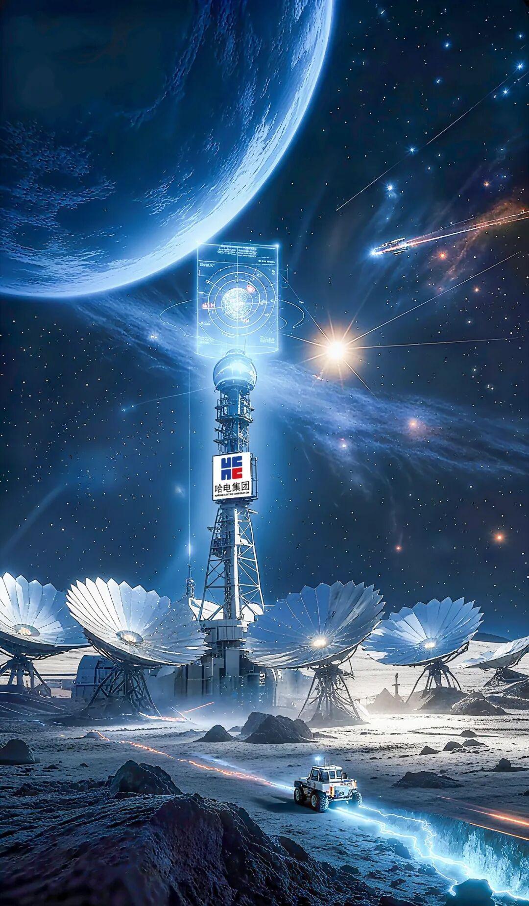 哈電集團的星際能源聚光塔直插星空,周邊碟形集熱器如銀蓮般捕捉月表光能。憑藉先進聚光與儲能技術,塔端系統高效轉化、傳輸能源,爲月球基地構築“星際能量中樞”,讓永續能源不再是科幻想象。