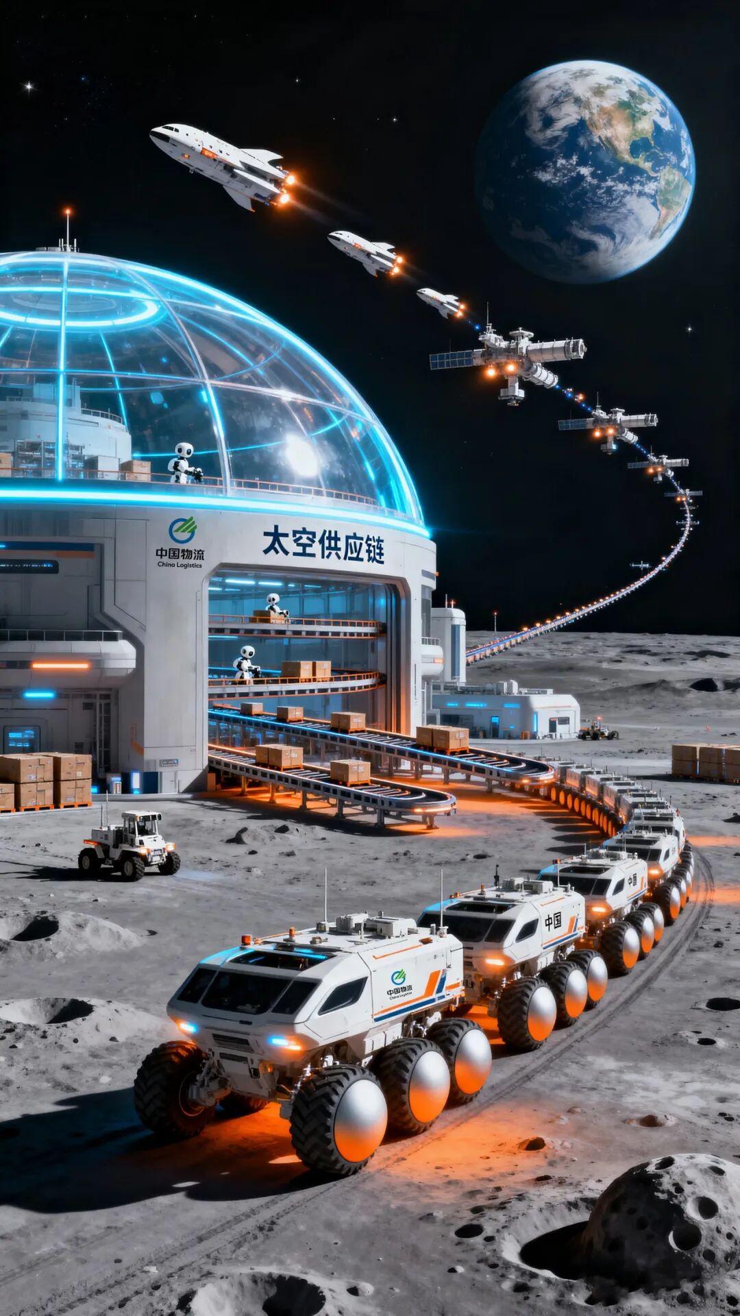月球的靜海基地旁,智能分揀機器人正在將來自地球的補給精準分類。中國物流的貨運飛船正有序前往目的地,構成了一條地月之間永不中斷的“太空供應鏈”。