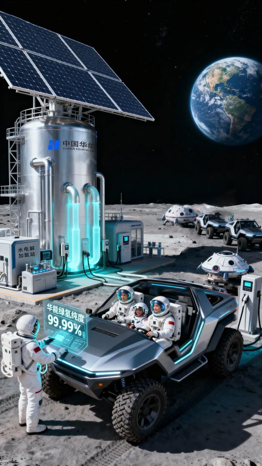中國華能水電解加氫站將月球上的水冰資源轉化爲發動機的重要燃料,生產的綠氫純度達到99.99%,且過程實現零碳排放,爲月球基地的可持續發展提供堅實的能源與物質基礎。