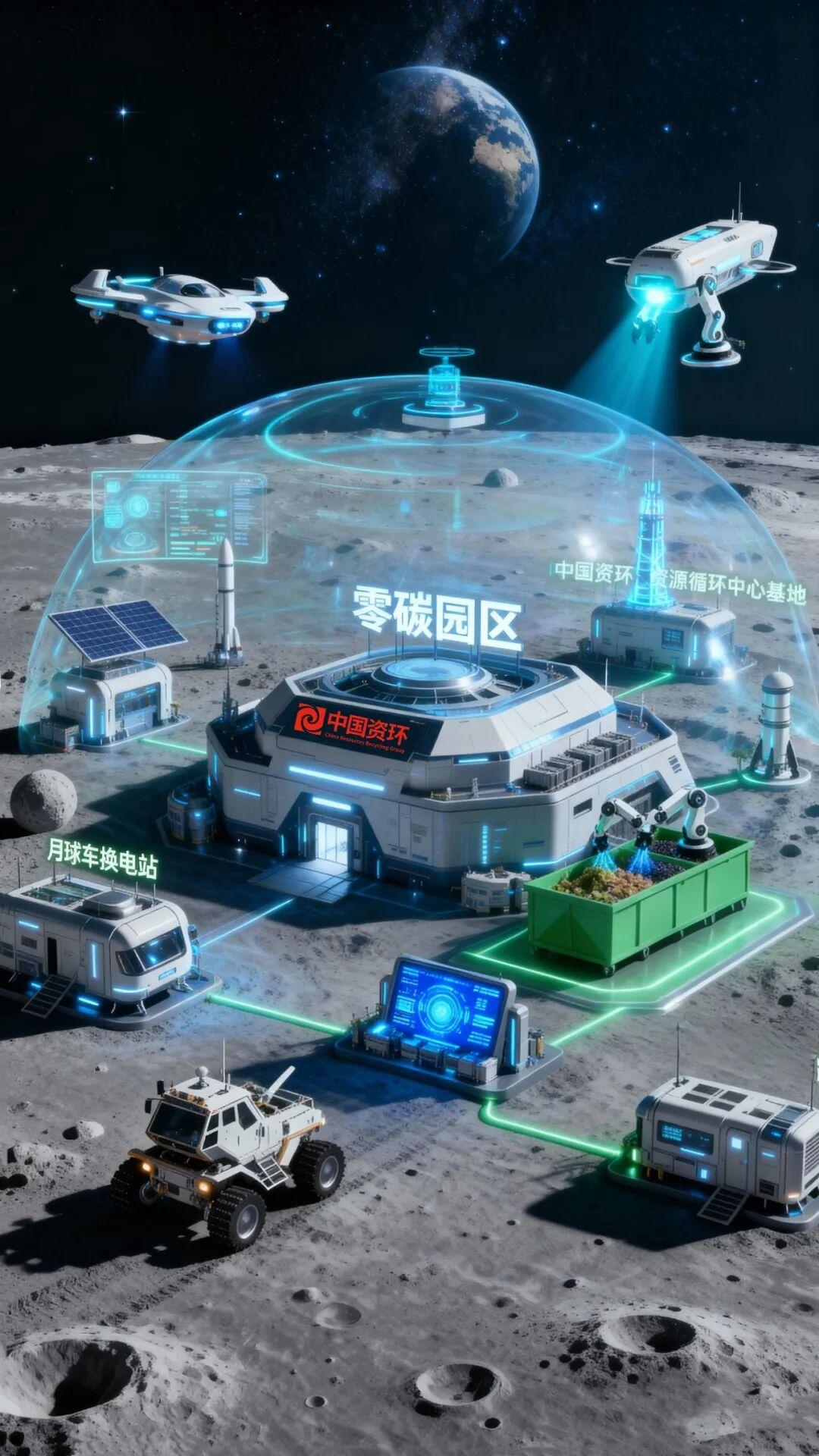 中國資環集團建立月球資源循環中心基地,在園區運行月球車換電站、綠色分揀中心、資源循環大數據平臺等產業,構建從綠色分揀到梯級利用、再生循環的完整鏈條,建成月地領先的“零碳園區”。