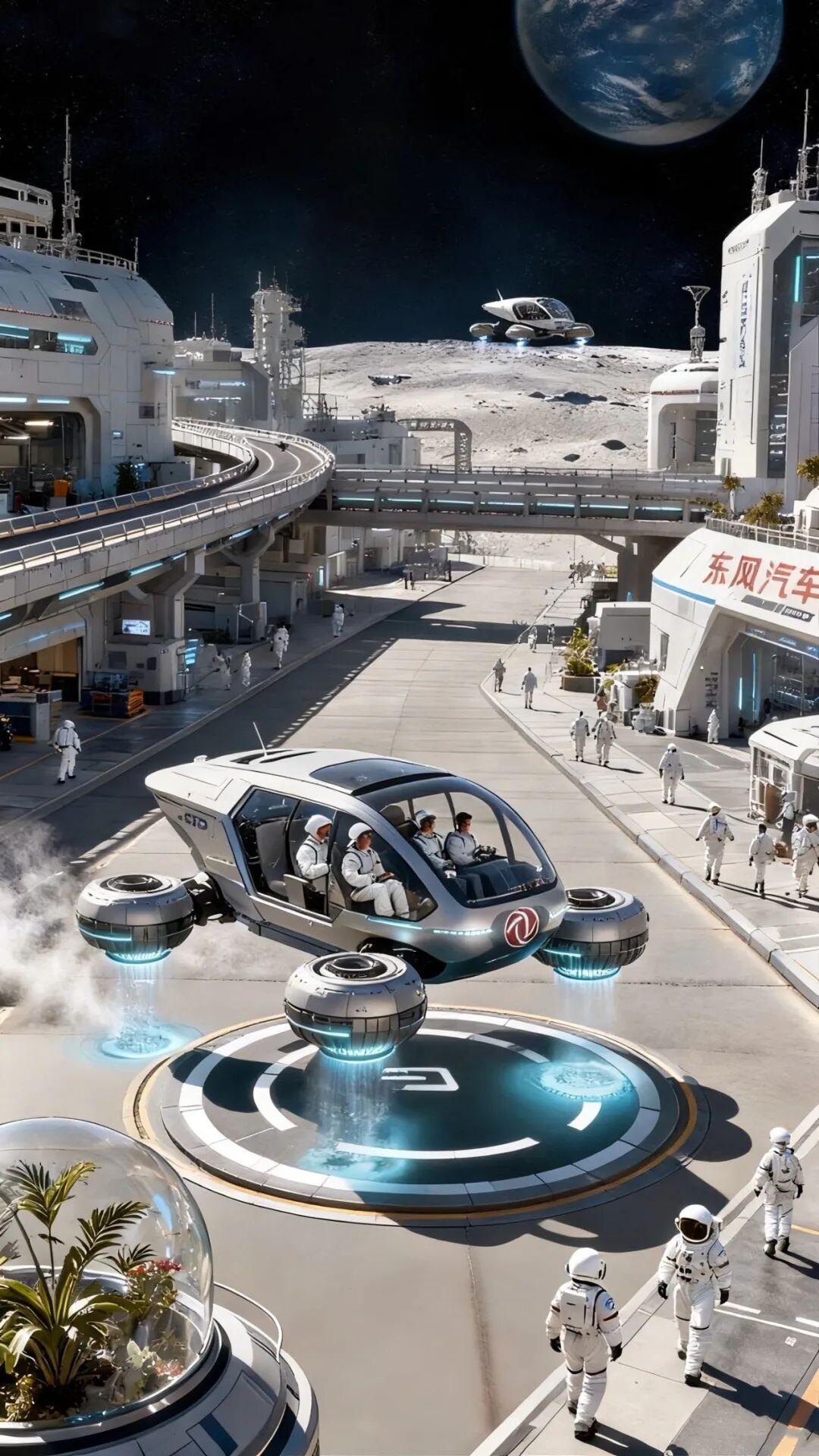 月球基地的街巷間,東風汽車研發的磁懸浮太空巴士正平穩起降。反重力驅動技術讓通勤如履平地,爲月球工作者打造高效、舒適的星際出行體驗,讓 “月球通勤自由” 成爲現實。