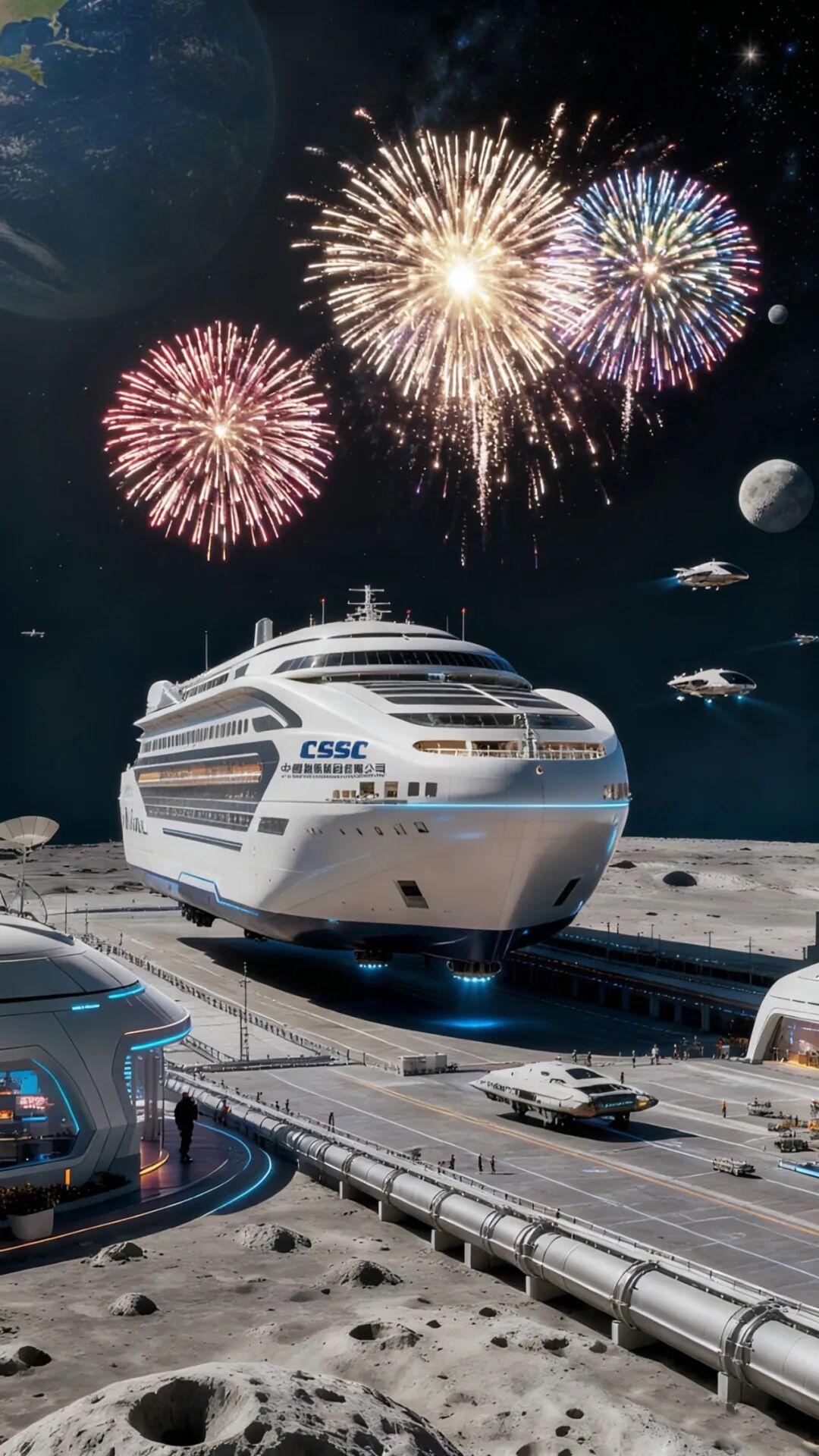 月球港灣的星空中煙花盛放,中國船舶打造的星際郵輪緩緩入港。它擁有豪華郵輪的舒適基因,以航天級造船技術適配星際航行,讓 “星際度假” 不再是幻想,成爲地月間流動的 “星際會客廳”。