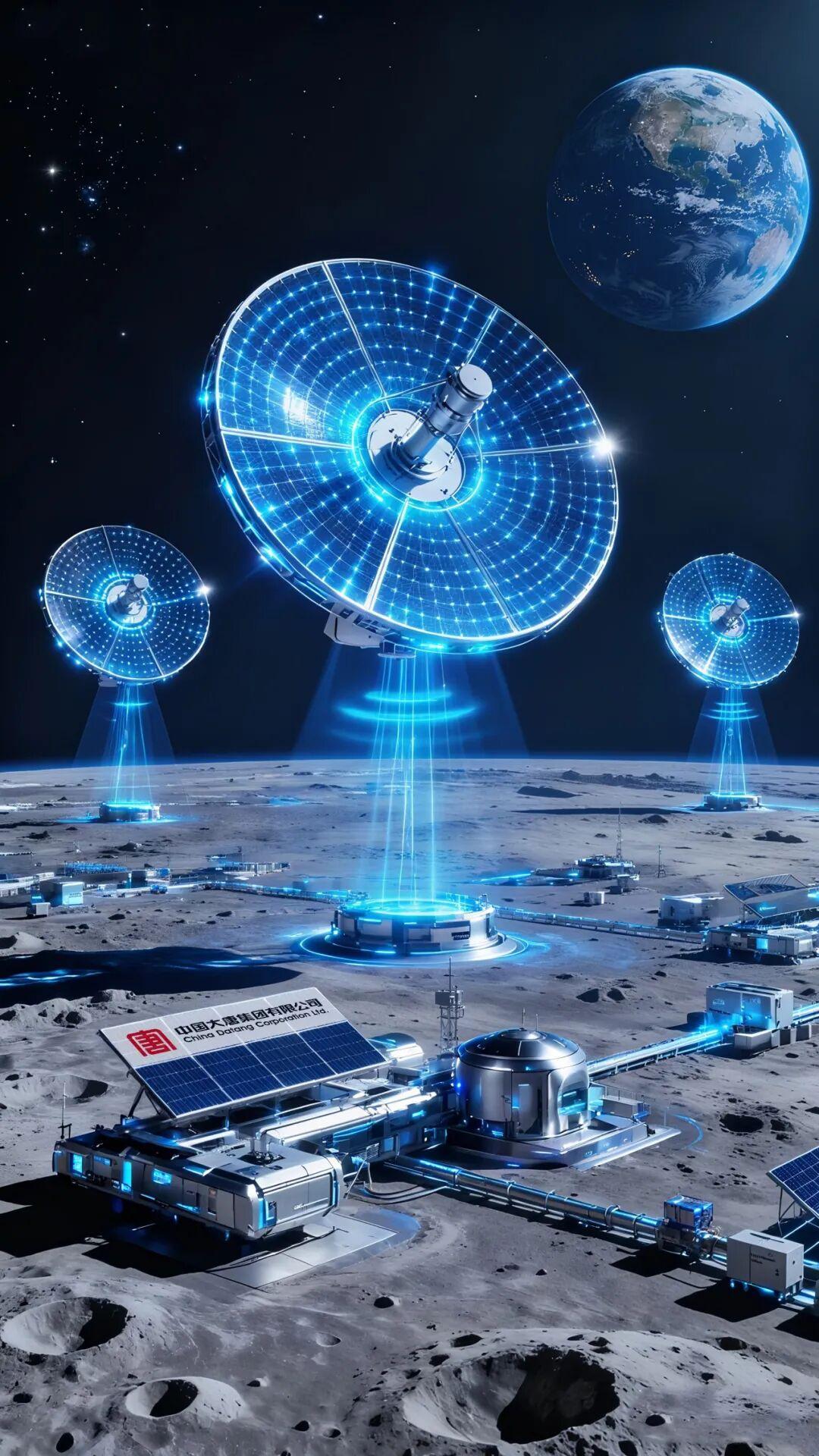 中國大唐的星際光伏樞紐如藍焰之花在月球綻放。巨形光伏碟陣高效捕獲月表光能,搭配智能儲能系統,爲月球基地穩定輸送電能,讓星際能源供給的 “綠色藍圖”照進現實。