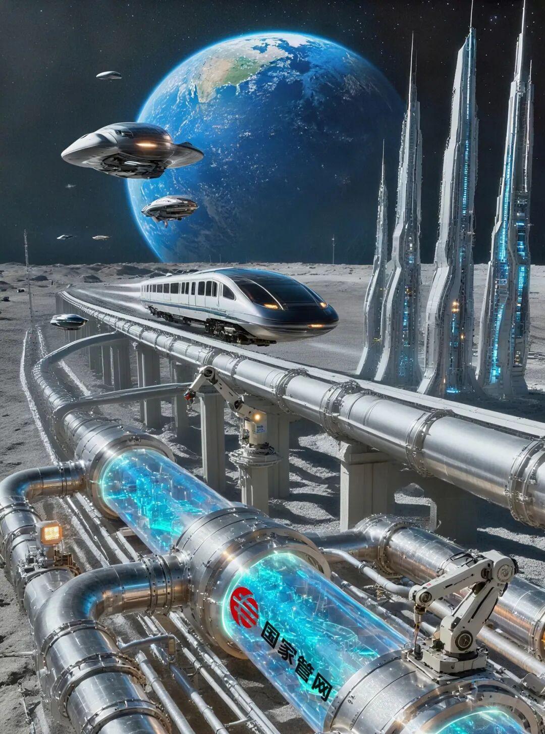 國家管網在月球上鋪設的管線如銀色動脈延展,傳輸高純度能源流體。依託智能監控與無人運維技術,管線高效穩定運轉,爲月球基建、交通等場景持續供能,築牢星際能源保障的“生命線”。
