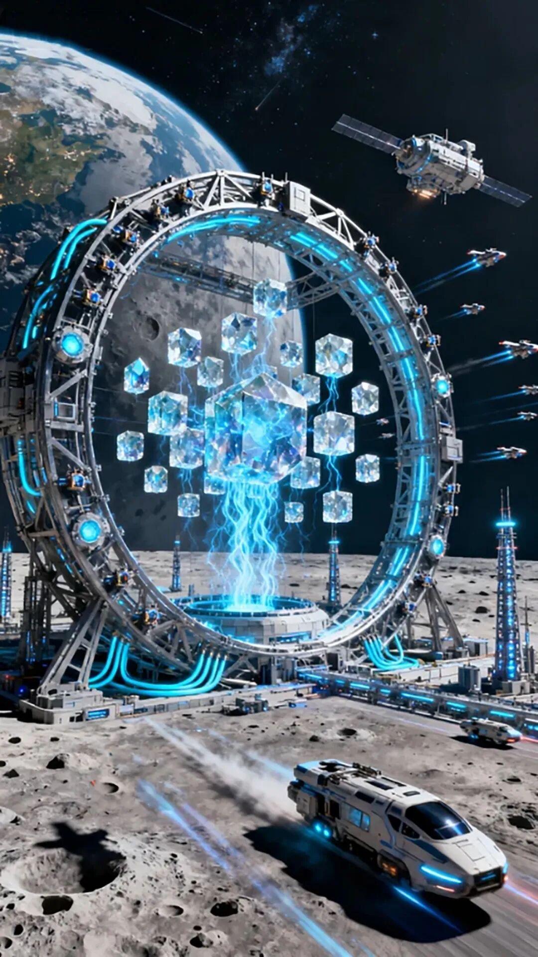 月球基地旁,南方電網的環形儲能樞紐如星河之環閃耀。它以先進技術聚合、調配星際能量,藍色脈衝在晶體模塊間奔流,爲月球交通、基建等全場景穩定供能,築牢星際能源網絡的“核心底座”。
