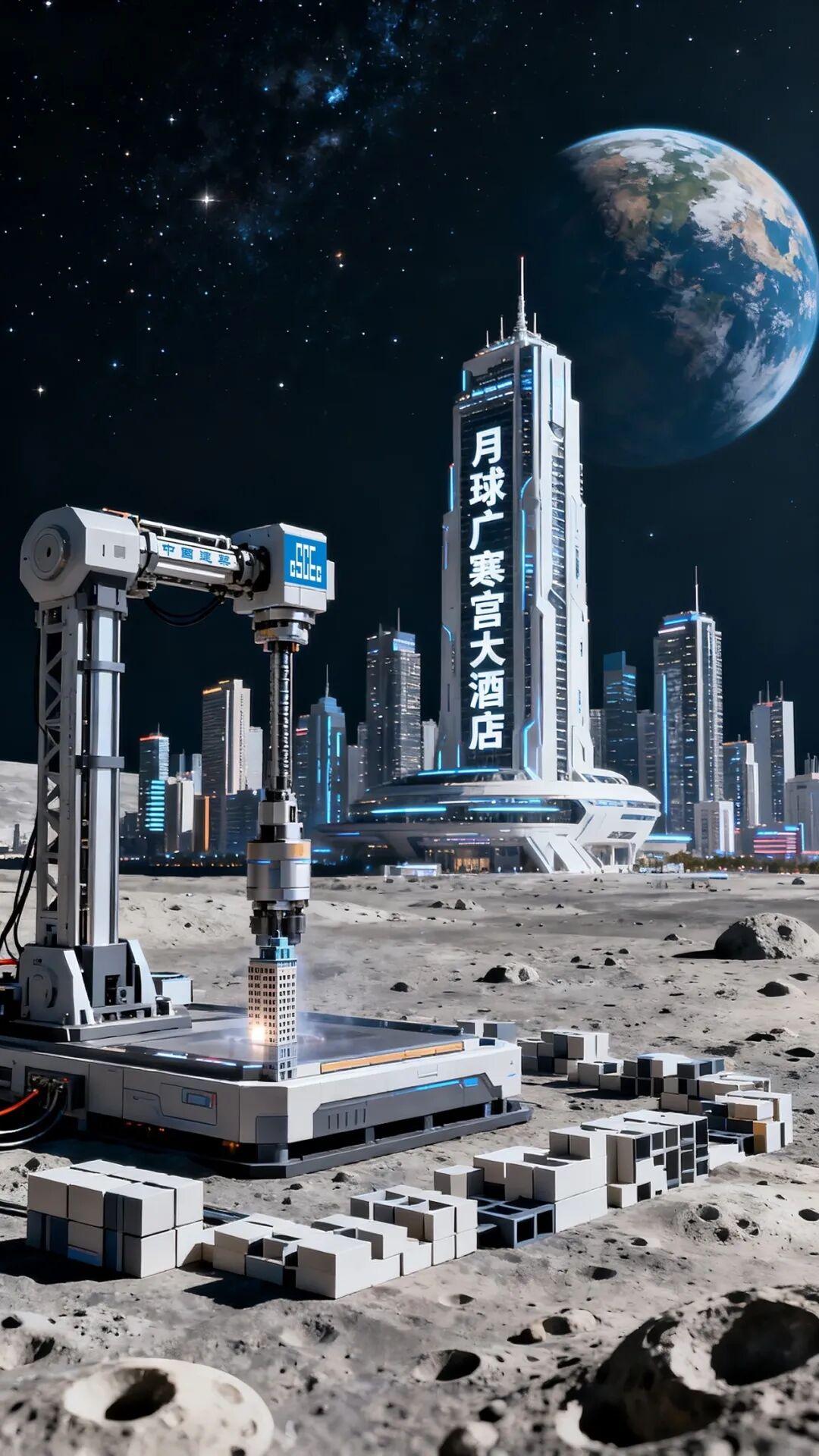 中國建築的巨型3D打印機在月球表面高效運作,以特種材料精準打印建築構件。打印出的模塊化構件通過智能機械臂快速運輸、精準拼接,讓一座座能抵禦宇宙射線與月表溫差的居住艙、科研站拔地而起。