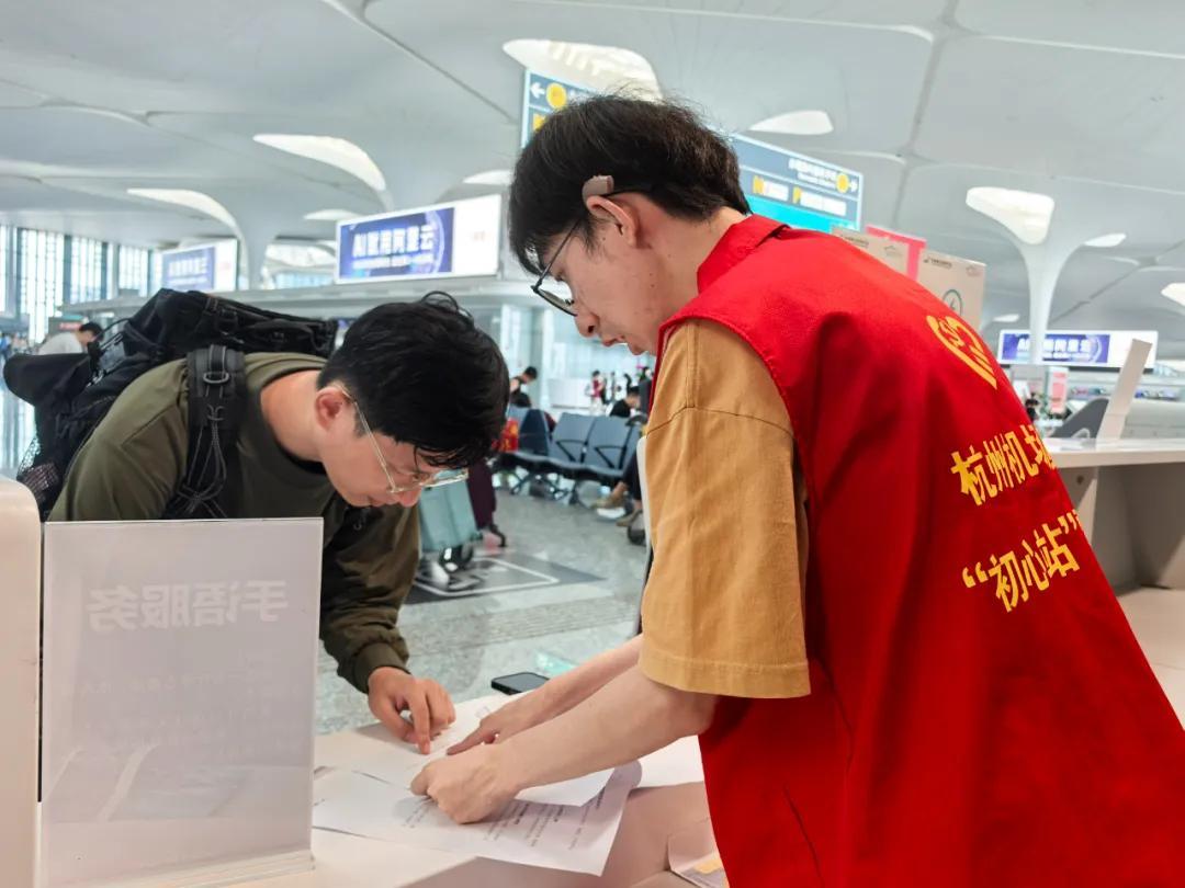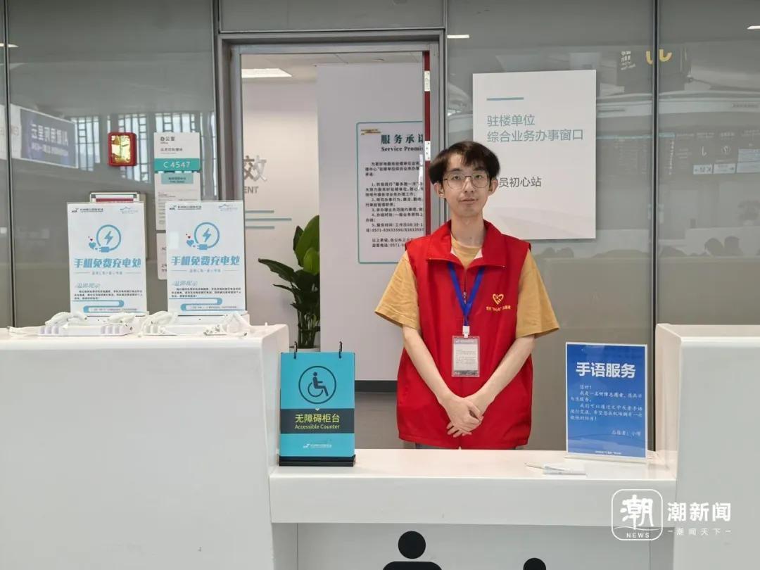 剛剛過去的長假,杭州機場“初心站”的聽障志願者繆宏傑依然忙碌在崗位上,即使是中秋節當天,他也堅守在崗。