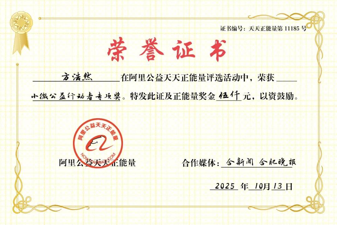 阿里公益天天正能量聯合合新聞、合肥晚報,爲方浩然頒發正能量特別獎及獎金5000元。