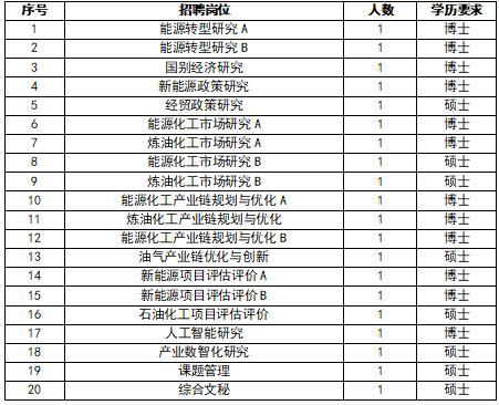 本次招聘人數爲20人,專業領域涵蓋化學化工、石油工程、材料學、新能源、能源動力、經濟學、企業管理、計算機科學、人工智能等專業,具體要求請登錄中國石化招聘官網搜索“經濟技術研究院”進行查看。