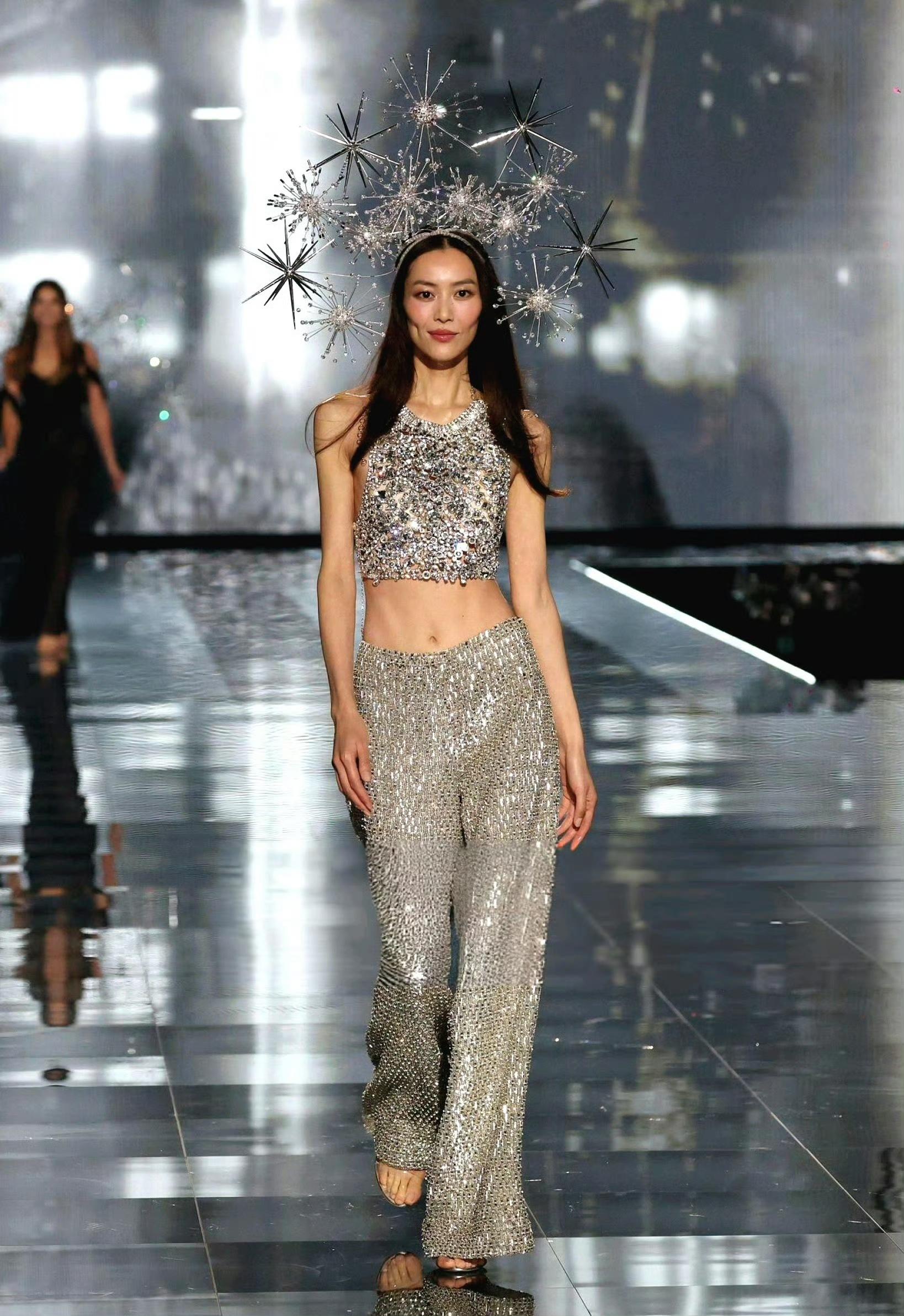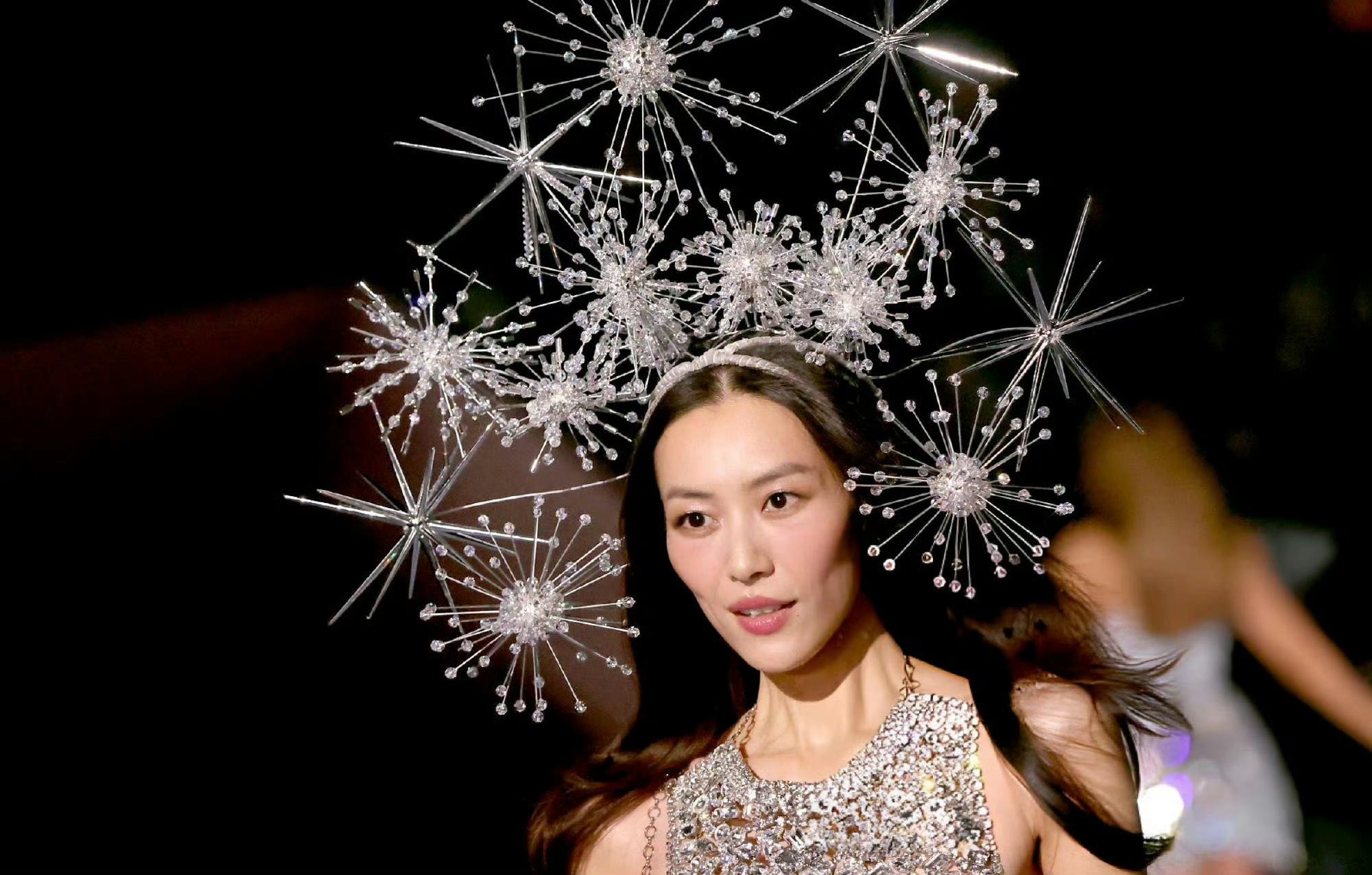 細數劉雯九次維密之旅的造型變遷,恰是一部女性自我定義的進化史。2009年她以"青花瓷"造型初登維密時,刻意凸顯的東方元素背後,是新人面對國際舞臺的不安;2024年迴歸秀場的淡粉色翅膀,展現的是歷經沉澱的從容;而今雪花女神與紅色褲裝的組合,則宣告着她對多元風格的絕對掌控權。