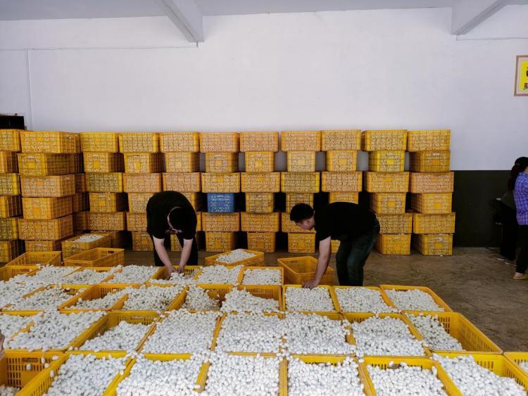 中國一汽在廣西鳳山縣文裏村支持建設種桑養蠶基地,文裏村工作人員正在將收購的蠶繭裝箱 中國一汽供圖