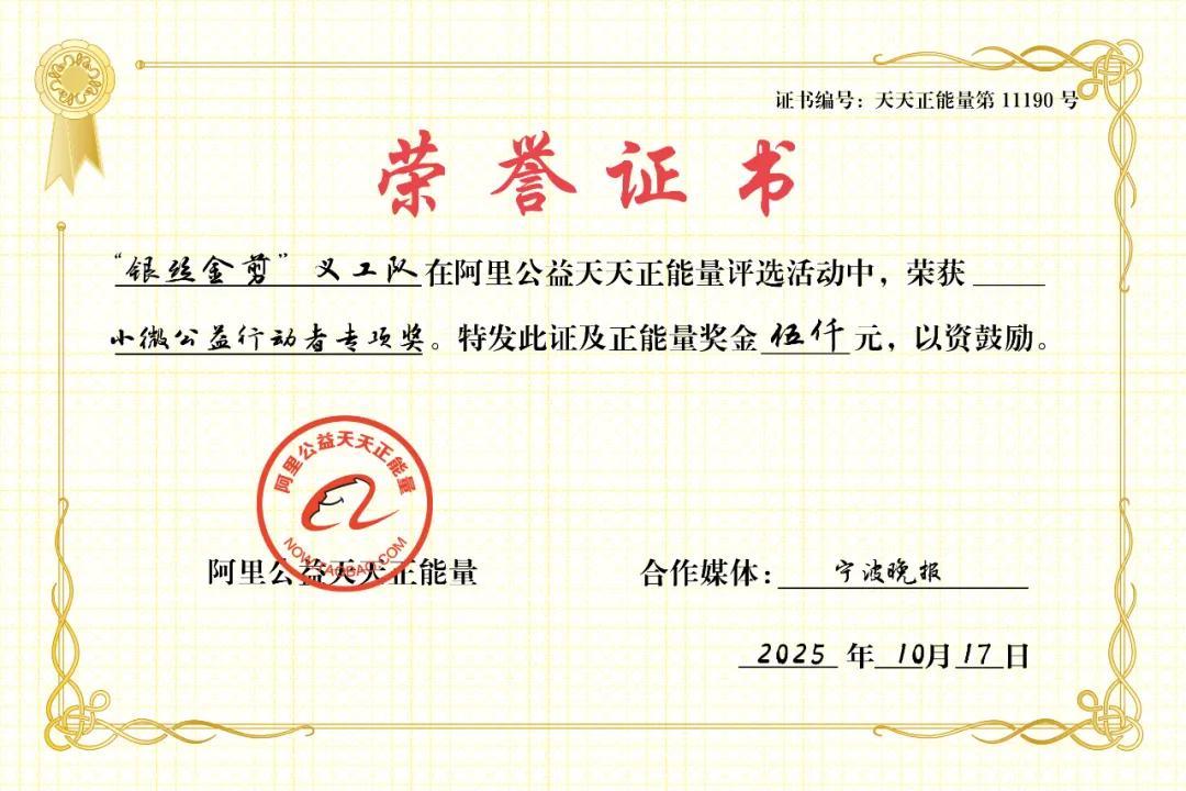 在此,我們聯合寧波晚報,將這份天天正能量獎授予寧波“銀絲金剪”義工隊。感謝你們,用一把金剪,裁出了生命謝幕時最溫暖的輪廓,也爲我們的城市剪出了一道最高貴的人文風景。